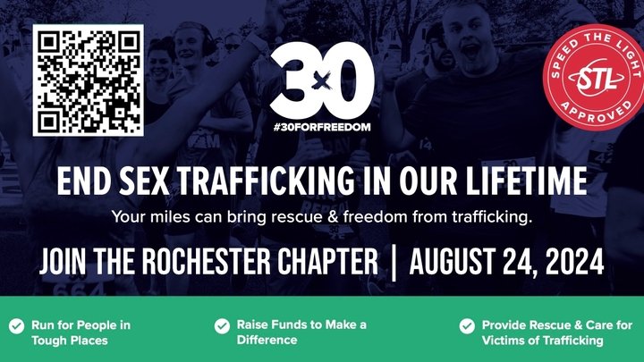 Join us on August 24, 2024 right here in Rochester as we host the first ever Rochester Chapter of 30xFreedom! Commit to logging miles and raising funds that we can see lives freed from sexual exploitation.